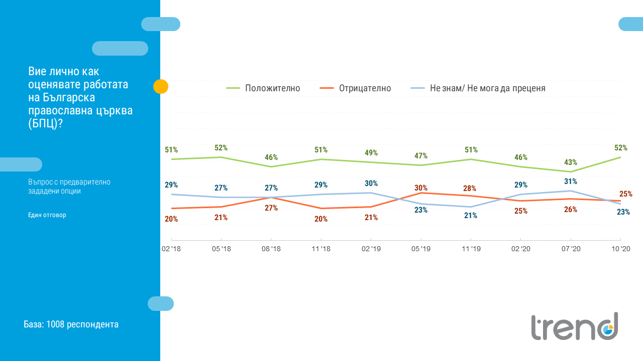 След определени колебания в отношението към църквата около COVID-19 и дебатите около посещенията в храмовете около Великден, през октомври положителното отношение се връща на нивата от миналата година. Така БПЦ е институцията в България, която се ползва с най-високо доверие, отбелязват от "Тренд".