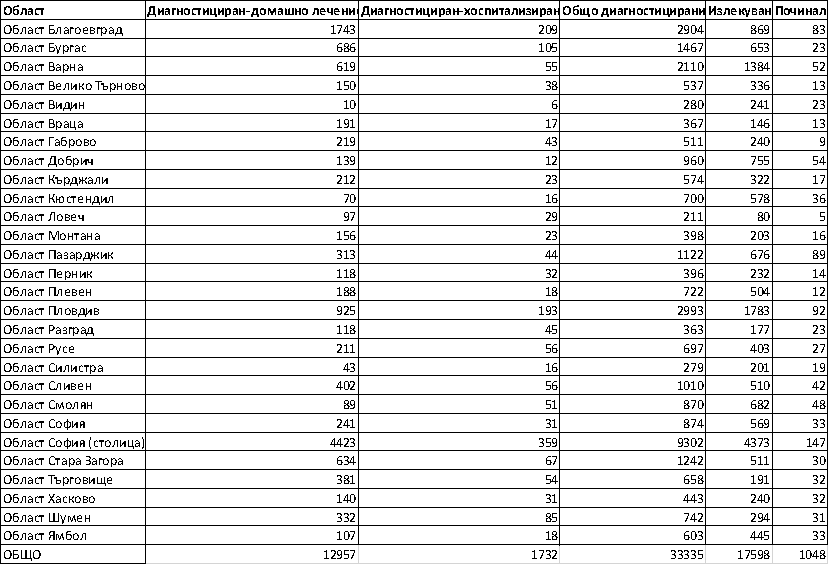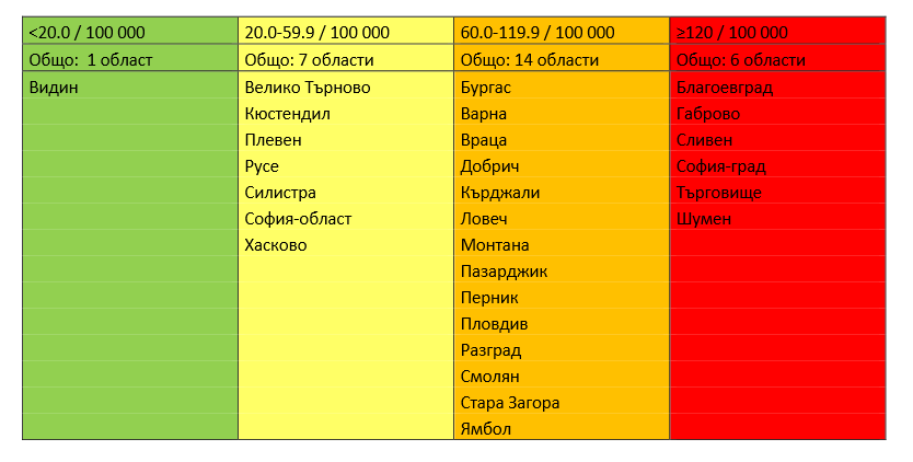 Само една област е в зелената зона с под 20 заразени на 100 хил. души. Шест области в червената, при която показателят скача до 120 на 100 хил. души - Благоевград, Габрово, Сливен, София-град, Търговище, Шумен. Според главния държавен здравен инспектор доц. Ангел Кунчев през следващите дни е логично да се очаква, че някои от областите в оранжево ще минат към черевената зона.
