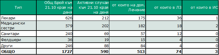 Недостигът на медици става все по-голям проблем, за да функционира системата. Активните случаи на лекари, медицински сестри и друг персонал към 21 октомври са 590.