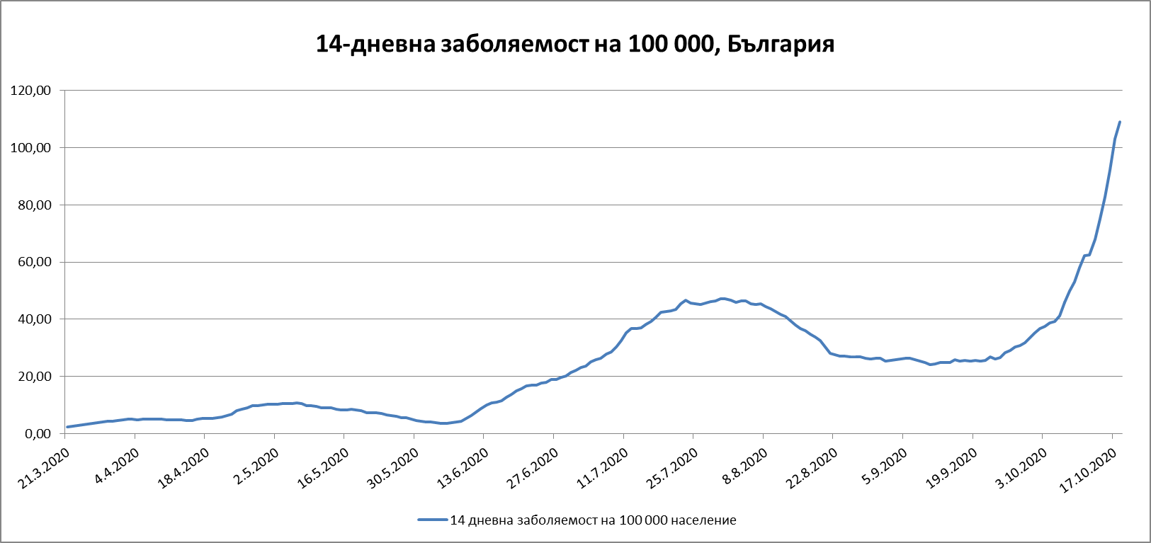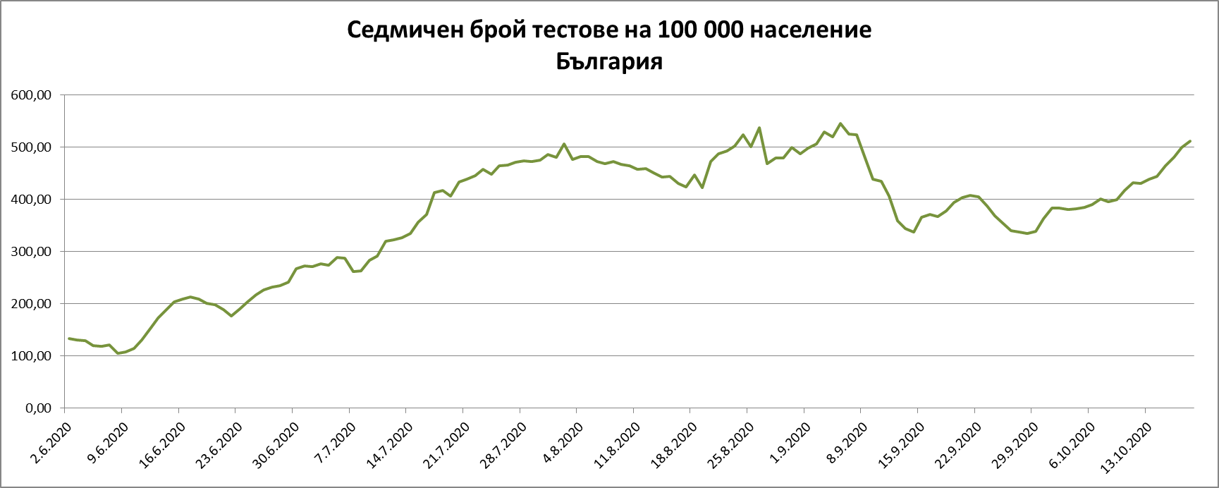 14-дневната заболеваемост в България продължава да има много остра крива. По другия показател - за 14-дневна смъртност - увеличението продължава, но с по-бавни темпове в сравнение със заболеваемостта. В България показателят "седмично тестване" е малко над 500 на 100 хил. души население. Положителност на тестовете - 16 на сто. Кривата на хоспитализираните върви плътно нагоре. Процентът на хората, които имат нужда от лечение, остава същият като предишни седмици", отчете още Кунчев.