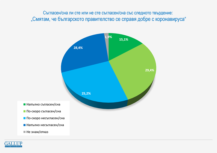 На границата на октомври и ноември общо 44,5% са напълно съгласни (15,1%) или по-скоро съгласни (29,4%), че правителството се справя добре със ситуацията с коронавируса, а общо 53,6% са по-скоро несъгласни (25,2%) или напълно несъгласни (28,4%).