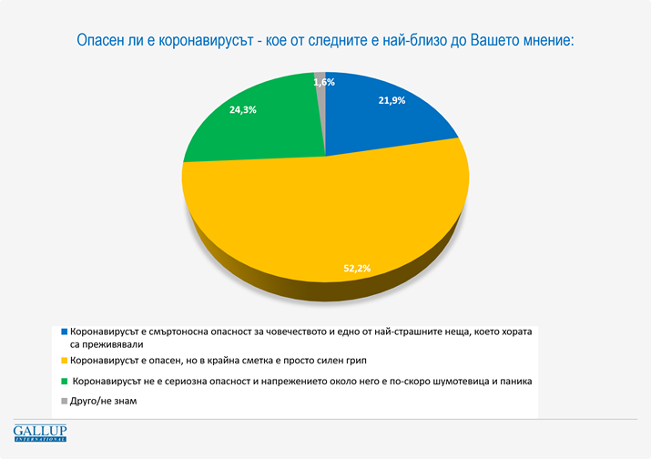 В края на октомври 21,9% избират опцията „Коронавирусът е смъртоносна опасност за човечеството и едно от най-страшните неща, което хората са преживявали“. 52,2% избират по-умереното „Коронавирусът е опасен, но в крайна сметка е просто силен грип“. 24,3% намират, че „Коронавирусът не е сериозна опасност и напрежението около него е по-скоро шумотевица и паника“.