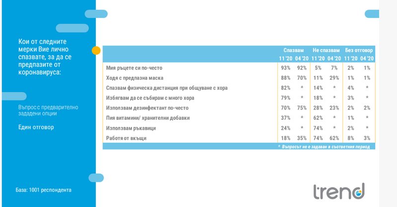 Запазване на дяловете по отношение на миенето на ръце като мярка за предпазване от коронавирус се отчита през ноември спрямо април тази година – 93 към 92%. През ноември се отчита и повишаване на дела на хората, които декларират, че носят предпазни маски – 88% към 70 на сто през април.