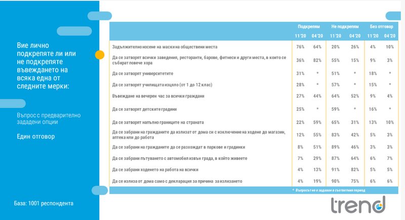 В проучването е било изследвано мнението на хората спрямо различни мерки, които държавата е въвела или се обсъждат. Отчита се повишаване на подкрепата по отношение на задължителното носене на маски - 76% през ноември спрямо 64% през април. Същевременно се отчита намаляване на подкрепата за затваряне на всички ресторанти, барове, фитнеси и други места, в които се събират повече хора. 36% от хората подкрепят тази мярка през ноември, докато през април този дял е 82 на сто.