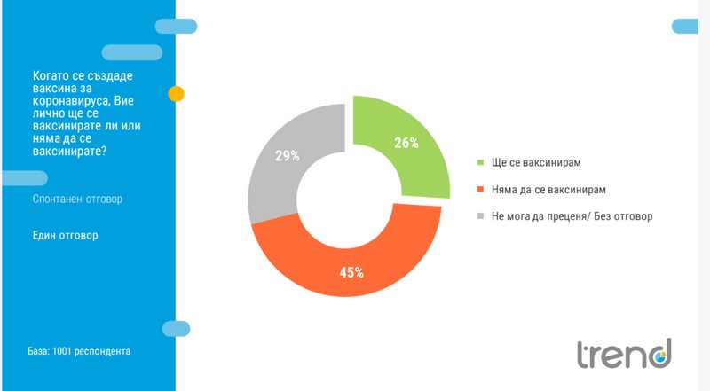 26% от българите посочват, че ще се ваксинират, а 45 на сто не споделят това мнение. Не се отчита особена динамика по отношение на възрастта на хората. Жените са по-колебливи в решението си спрямо мъжете. В друго проучване на „Тренд“ по отношение на ваксинирането се регистрират определени стереотипи, които са видни и по отношение на бъдещите ваксини срещу коронавирус.