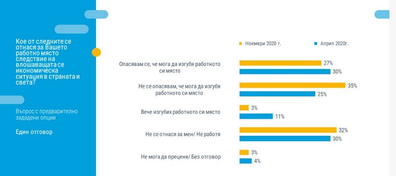 През ноември българите се чувстват по-сигурни за работните си места спрямо април. Липса на опасения за работните си места имат 35% от хората през ноември, докато през април делът е 25%.
