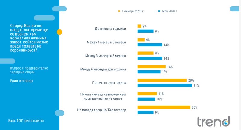 Намалял е делът на хората, които смятат, че в по-кратък срок ще се върнем към нормалния си начин на живот спрямо май тази година. Значително увеличаване на дела на хората, които не могат да преценят - 30% спрямо 9% през май. За 28 на сто от хората ще бъде необходимо повече от една година, за да се върнем към нормалния си начин на живот.