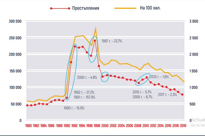 Ясно се очертават пикове на престъпленията при катаклизми като "Лукановата зима", после през зимата 1996-1997 г., а после през 2009-2010 г., както и следващите години, който ръст обаче е отразен в проучванията на ЦИД, но не и в статистиката на МВР.