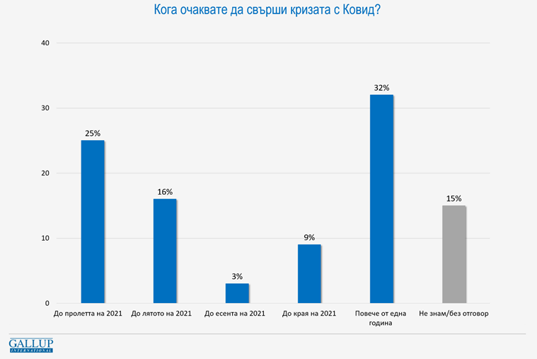 Надеждата на 25% е, че кризата ще отшуми до пролетта, 16% избират „до лятото“, 3% допускат завършекът да e през есента, а 9% - в края на 2021 г. Останалите признават, че не могат да определят. Това е сериозно отрезвяване спрямо началото на лятото, когато около 60% вярваха, че ще има нормализация до края на годината. С ръста на случаите по-късно през лятото този дял спадна до около една трета още през юли.