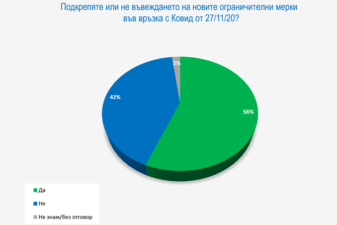 Очевидно мерките са в състояние да донесат известно успокояване. От гледна точка на общественото мнение мерките явно идват навреме, защото обществото през последните месеци като че ли и самостоятелно достигна до идеята за нови по-строги мерки. През лятото например мнозинство от над 60% беше против втвърдяването на мерките въпреки нарастващите и тогава случаи. Към началото на ноември обаче мненията „за“ и „против“ втвърдяване на мерките вече бяха поделени поравно. Без да има особено мнозинство в подкрепа на втвърдяване, това все пак показа, че сериозните числа при новозаразените, а и примерите от чужбина, карат и българите да „свикват с мисълта“, че ново затягане е въпрос на време.
