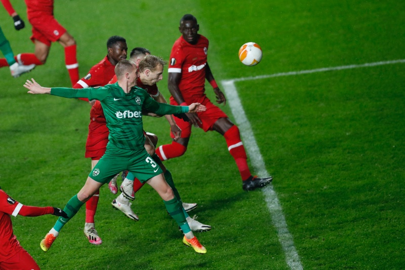 И получи гол във вратата си - Личи де Лаат засече топката при центриране от свободен удар - 2:1 в 71-ата (долу). До края "Антверп" не изпусна контрола, а разградчани изглаждаха като в началото на срещата.