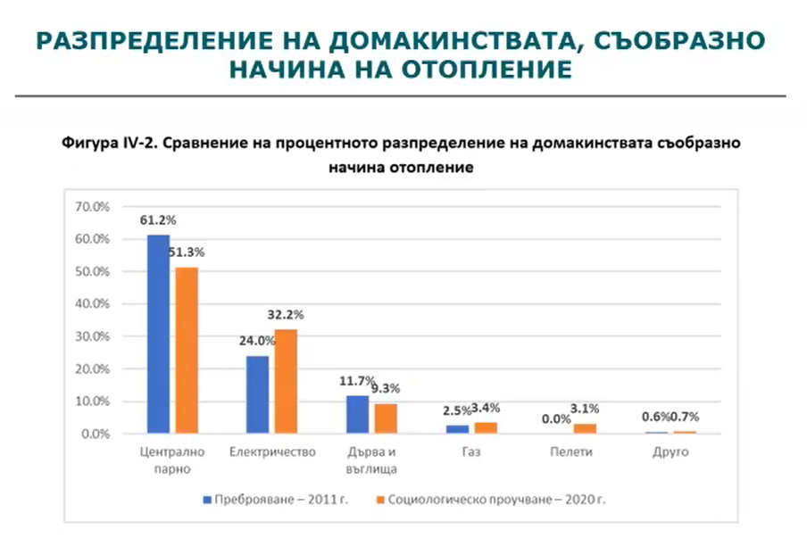По отношение на начините за отопление - централно парно, електричество, дърва и въглища - консултантите направиха сравнение между 2011 г. и 2020 г. на базата на преброяването на населението от НСИ в първия случай и социологическо проучване във втория. Там данните сочат, че има спад в отоплението с парно и ръст в ползването на електричество, но малка промяна при употребата на дърва и въглища.