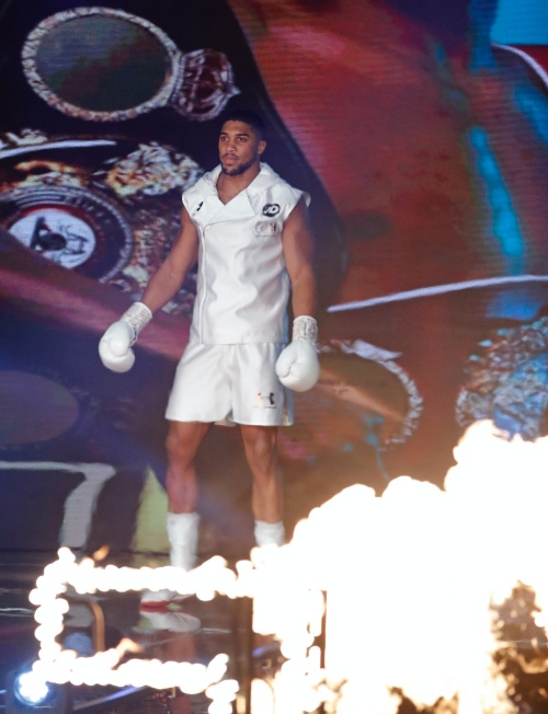 Малко след това се появи и Антъни Джошуа - с надъхващи думи на видеоекрана и по пътека, от двете страни на която бяха запалени буквите AJ. Ехтеше друг боксов хит - Burning heart (от "Роки") на легендарната рокгрупа "Сървайвър".