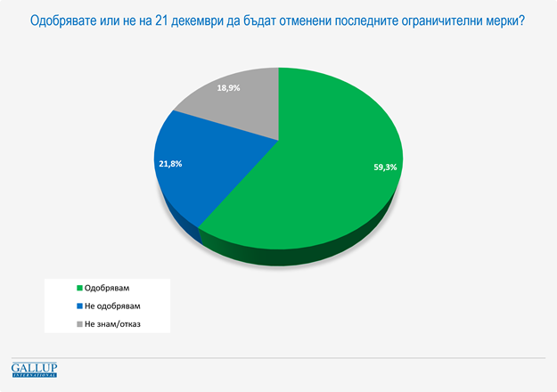 59,3 на сто от анкетираните смятат, че мерките след 21 декември трябва да бъдат отменени. Това мнение влиза в рязко противоречие с позицията на здравния министър Костадин Ангелов, който в понеделник сутрин обяви, че смята, че ограниченията трябва да останат и по време на празниците, и с вижданията въобще на здравните власти в страната. За обмисляне на отслабване на мерките заговори през миналата седмица премиерът Бойко Борисов.