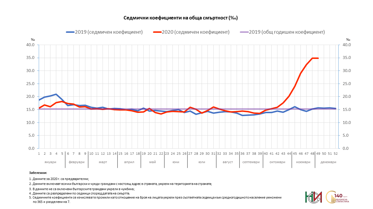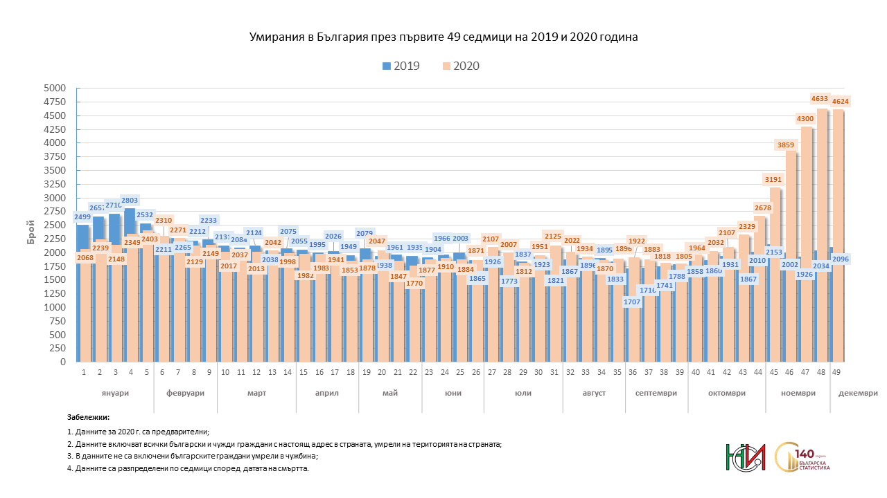 През първата седмица на декември, или 49-а за годината, смъртността спира да расте, но остава много висока. Това е слабо "добрата" новина от данните на Националния статистически институт за починалите през този период от 2020 г.