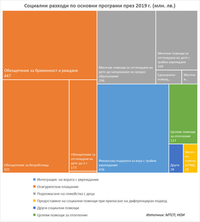 Нетните разходи – изплатените трансфери към бенефициенти без административните разходи за управление и поддържане на програмите – през 2019 г. достигат малко под 2,2 млрд. лева. Близо половината (48,5%) от тези разходи са с осигурителен характер. Тази структура не се променя особено в последните пет години, макар няколко фактора да разместват отделните компоненти – намалява броят на безработните, но средният размер на обезщетенията расте заради общия ръст на осигурителния доход, а с реформата в политиката към хората с увреждания част от плащанията от Националния осигурителен институт (НОИ) бяха прехвърлени към общия механизъм за финансова подкрепа в бюджета на МТСП.