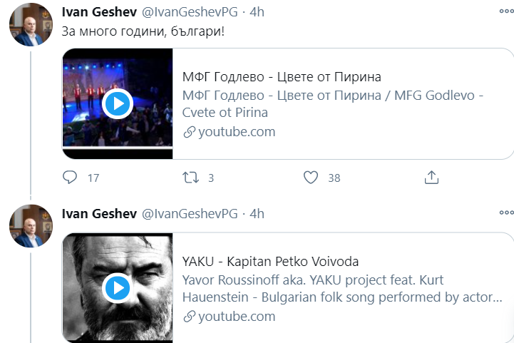 В профила си в туитър той е качил цели 3 песни с отявлена патриотична насоченост.