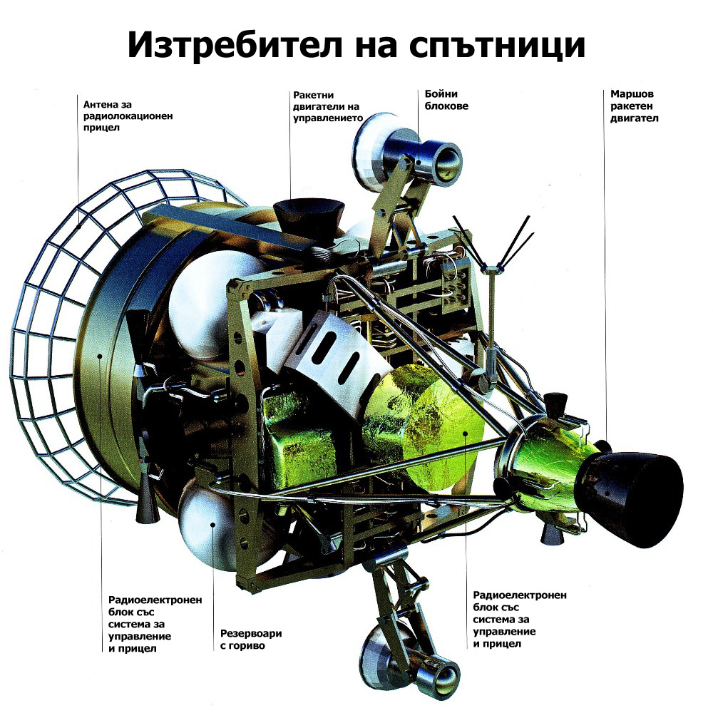 1. Спътникът-цел минава над зоната на действие на наземните средства на системата за контрол на космическото пространство (СККП). Извършва се точно определяне на орбитата на целта. Координатите се въвеждат в системата за управление на прехващача.