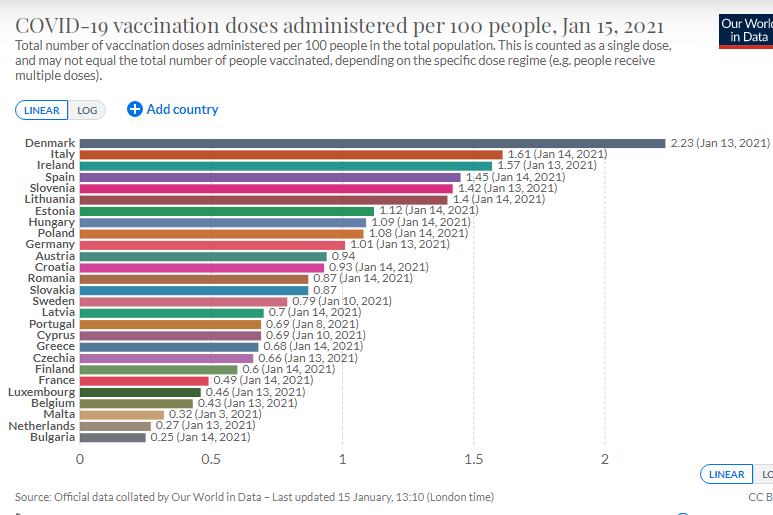 България заема последното място сред страните в ЕС според сложените дози от ваксината срещу COVID-19 на 100 души от населението.към 15 януари. Последните данни за страната са от 14 януари, но с новите ваксинирани, които са към следващите два дни - съответно 648 и 452-ма, ситуацията едва ли може рязко да се промени.