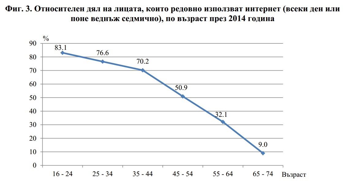 Сега идва най-важното. Разгледайте графиката по-долу. Тя показва какъв дял от хората в различните възрастови групи имат достъп до интернет. Сами си сметнете още колко живот им остава на изданията, които има предвид Ицо Хазарта в цитата от началото на текста.