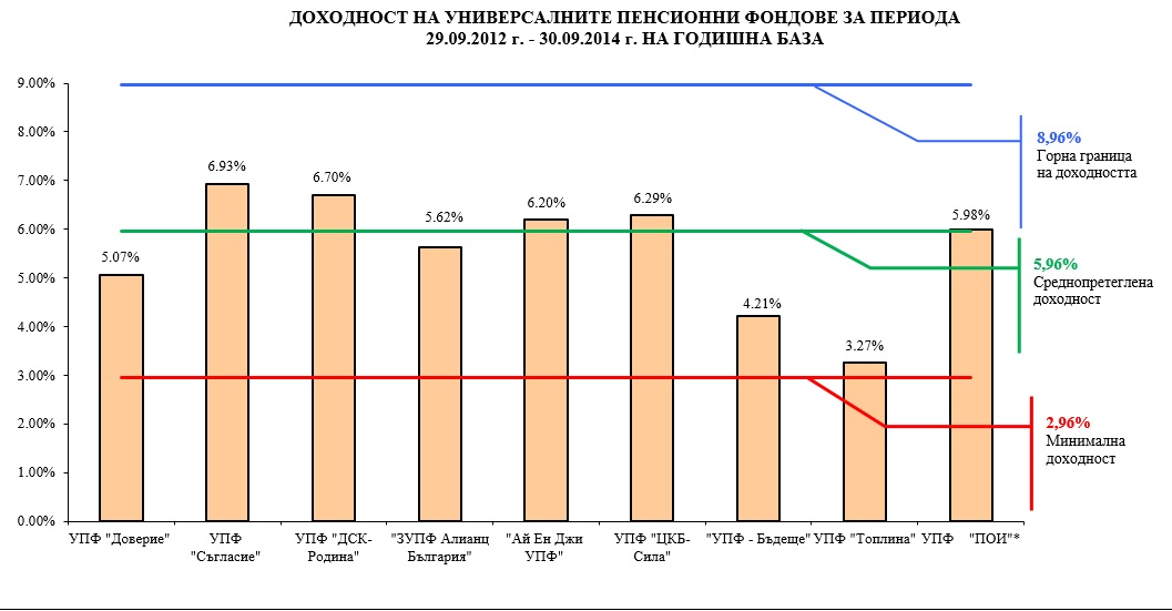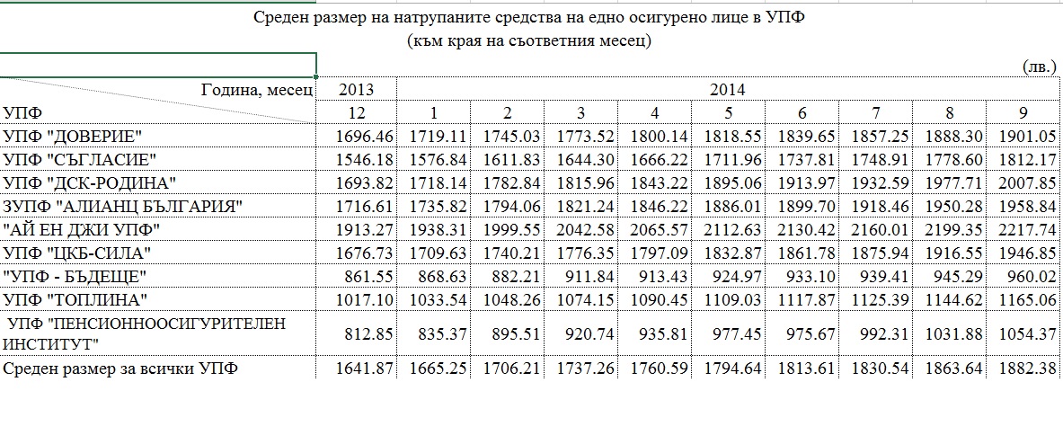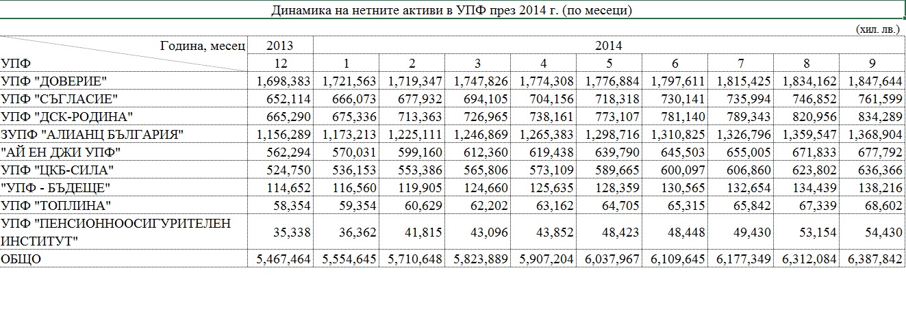 Без да навлизаме в допълнителни подробности, ето една моментна снимка на универсалните пенсионни фондове (УПФ) - схемите, които са задължителни за всички, родени след 1959 г., и където отиват 5% от техните доходи. Те са от отчетите за деветмесечието, публикувани на сайта на Комисията по финансов надзор.