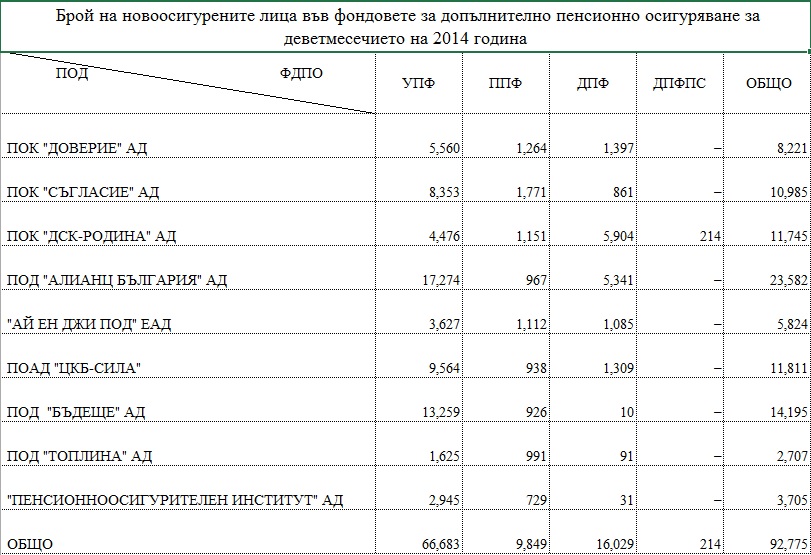 И все пак, ето данни за това кой колко нови клиенти е събрал от началото на годината - обърнете внимание на първата колона (УПФ). Определено лидерът "Доверие" губи инерция за сметка на "Алианц България", "Съгласие" и "ЦКБ-Сила".