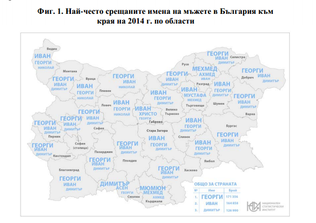 Най-разпространени сред мъжете в страната са имената Георги - 171 000, Иван - 165 000, и Димитър - 127 000. Следват Николай - 95 000, Петър - 77 000, Христо - 63 000, както и Александър, Стефан, Йордан, Васил и други. От всички мъже в страната 1 334 хил., или 37.9%, притежават 20-те най-разпространени лични имена.