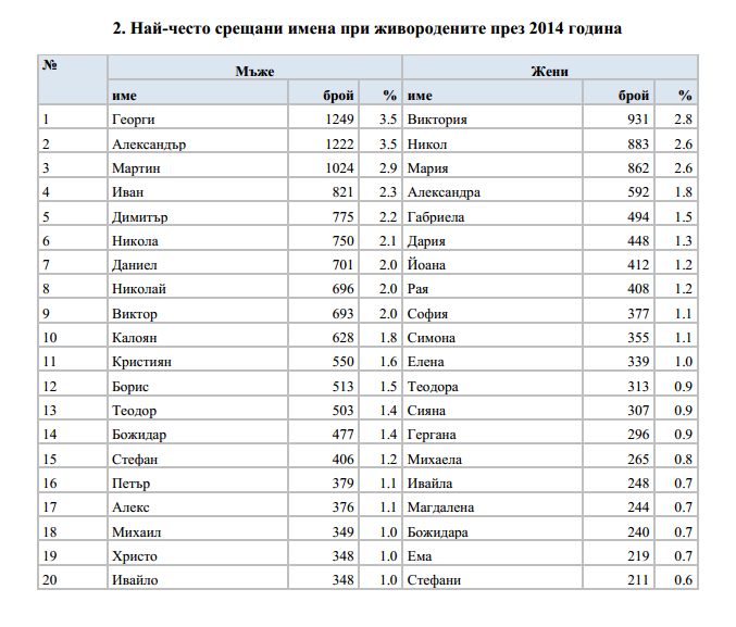 И през 2014 г. най-предпочитано за новородените момичета остава името Виктория - 931, следват Никол - 883, Мария - 862, и Александра - 592. В първите двадесет най-често срещани имена са и Габриела, Дария, Йоана, Рая, София, Симона и Елена.