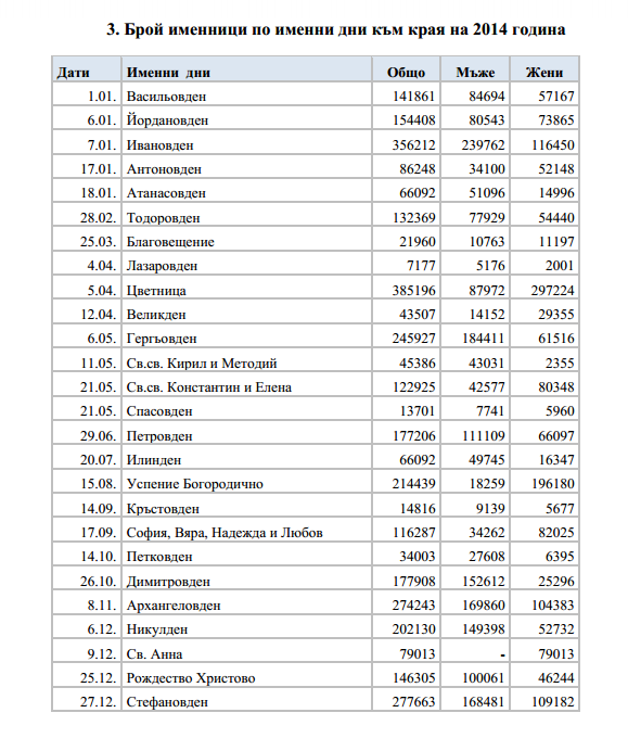 Най-много българи празнуват своя имен ден на Цветница - 385 хил. жени и мъже, следват празнуващите на Ивановден (356 хил.) и Стефановден (278 хил.).