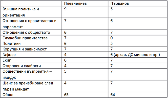 В заключение, таблицата по-долу онагледява този анализ чрез мои оценки от 0 до 10 (по-висока оценка – по-добро представяне) като използва президентстването на Първанов за сравнение. Дори да се абстрахираме от точните стойности на индикаторите, таблицата дава представа за силните и слабите страни на двамата президенти: