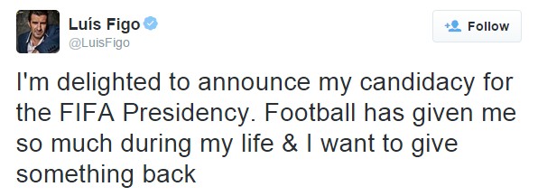 Това написа днес в профила си в туитър легенрадният бивш португалски футболист Луиш Фиго. По-късно той огласи намерението си в ексклузивно интервю за Си Ен Ен.