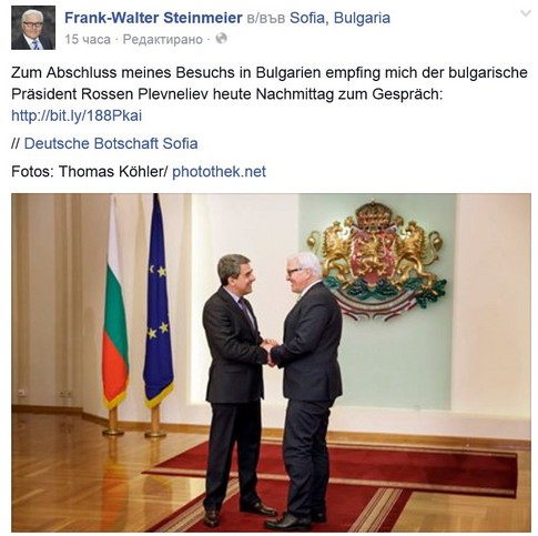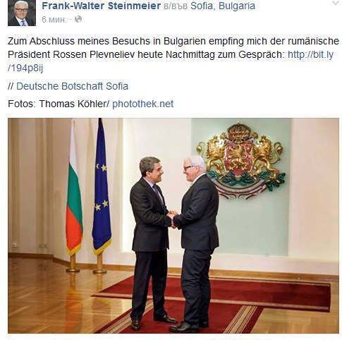 Това написа в профила си във фейсбук германският външен министър Франк-Валтер Щайнмайер малко след отпътуването си от България вчера, съобщи базираното във Виена електронно издание "БГ глас".