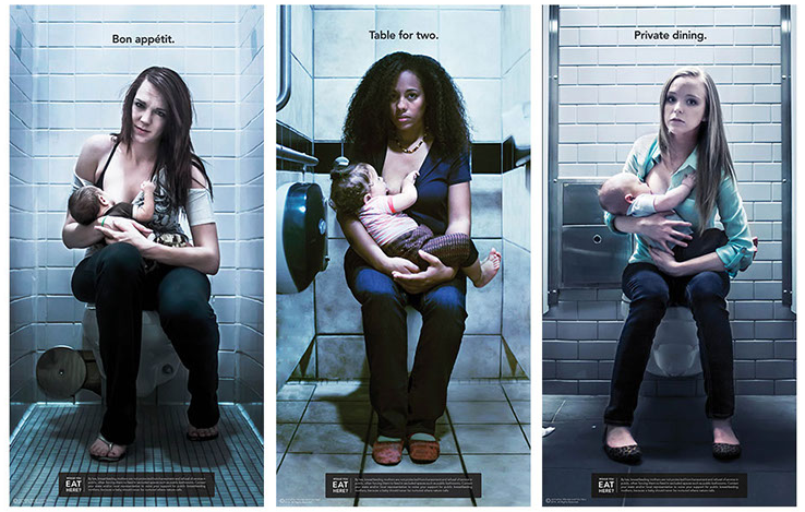 Припомня се и казус от САЩ с кърмещи майки. Тъй като редовно ги пращали да кърмят в тоалетните и в стаите за повиване, те започват кампания със снимки на хора в тоалетни с въпроса: Вие, нали не бихте се хранили там?