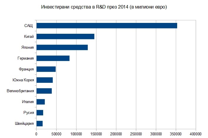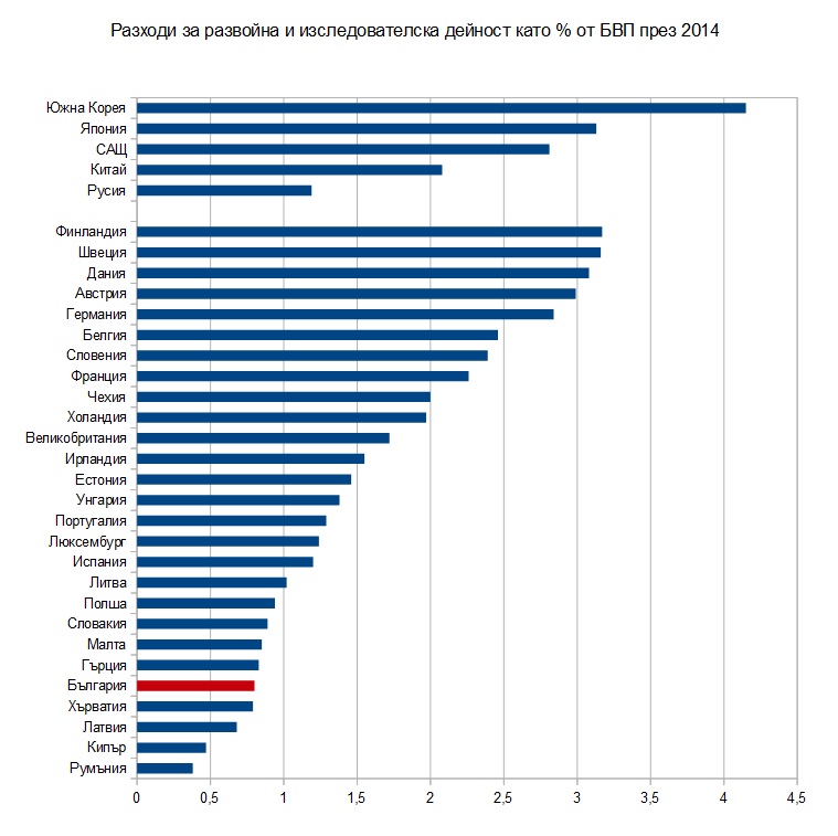 Тази графика подрежда държавите от Европейския съюз според отделените средства за R&D дейности, а най-отгоре са данните за още пет страни – Русия, Китай, САЩ, Япония и Южна Корея. Руснаците отделят само 1,19 %, докато китайците инвестират над 2%, американците – почти 3%, японците – над 3%, а корейците са световни първенци с 4,15% от БВП. Това обяснява защо във всеки дом има поне нещо от корейска компания – телевизор, телефон или пералня.