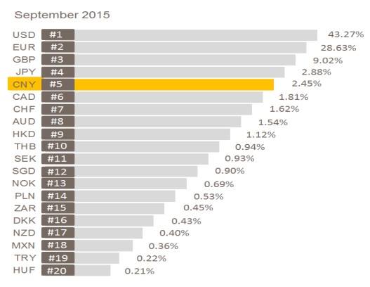 Ето и таблица на системата за международни банкови разплащания SWIFT, която показва актуалния пазарен дял на съответните валути.