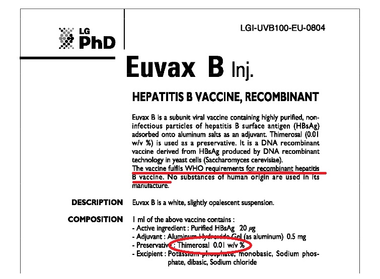 2. Има ли във ваксината живак? Набедената за опасна "Еувакс" съдържа "страшния" за много хора тиомерсал, който деактивира бактериите, от които се очаква да предизвикат имунен отговор. Освен това се използва и като консервант, защото предотвратява развитието на спори и гъбички в субстанциите. Тиомерсалът обаче няма нищо общо с живака от старите термометри (известен като метилживак и токсичен във високи дози), а е дериват на етилживака, който е напълно безвреден за човешкия организъм. Препоръчителната доза в Европейския съюз е до 2 микрограма на ампула, а според листовката, одобрена от Световната здравна организация (СЗО), "Еувакс" съдържа 1 микрограм (0,01 w/v%) тиомерсал. От СЗО уточняват също, че продуктът изпълнява всички изисквания за рекомбинантна ваксина срещу Хепатит Б.
