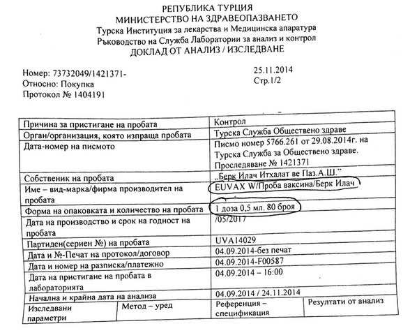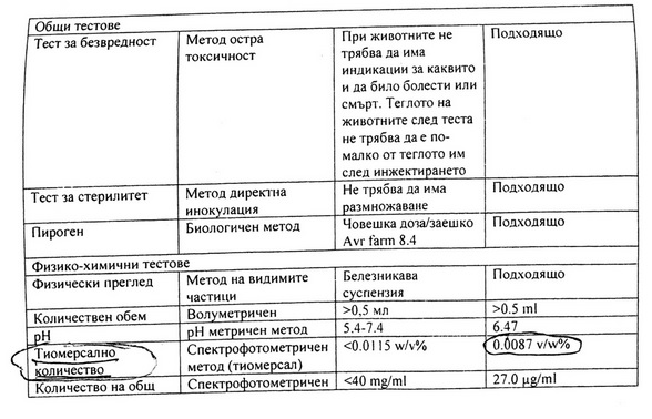 Що се отнася до скандалните 8,7 микрограма в пробата на самото турско здравно министерство, те се дължат на най-обикновено недоглеждане или слаба математика. В лабораторния анализ са посочени две стойности - референция (т.е. допустимо количество) <0,0115w/v% тиомерсал и резултат от теста 0,0087w/v%. Цифрите зад запетаята действително са много, но по-наблюдателните веднага ще отбележат, че второ число е по-малко от първото и напълно отговаря на спецификацията. Да не говорим, че 0,0087w/v% не са 8,7 микрограма, а 0,87 микрограма, което е дори по-ниско от записаните в оригиналната листовка 0,1 микрограма. Ако не вярвате, вижте заблудата сами (огражденията не са на Клуб Z): Копие от пробата на ваксината "Еувакс" (факсимилето вляво).