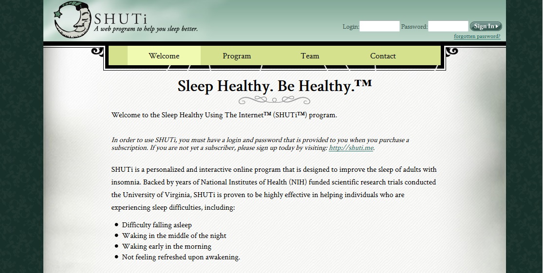 Програмата се нарича SHUTi (съкратено от английското описание Sleep Healthy Using The Internet или "Спете здравословно, ползвайки интернет") и вече има свой интернет сайт - www.shuti.me (засега само на английски език). Организирана е в 6 онлайн сесии, всяка от която с продължителност от 45 до 60 минути, но с включени упражнения, които се практикуват в рамките на седмица. Сесиите се заплащат (135 долара за 4-месечен достъп), но дават и гаранция, че потребителите ще заспиват за не повече от 20 минути или с поне 40% по-бързо от преди, а случаите на среднощно събуждане ще намалеят с около 55 на сто. Другото обещание е до месец и половина да са преборили безсънието, за да могат сами да възкликнат "Аз съм нов човек!".
