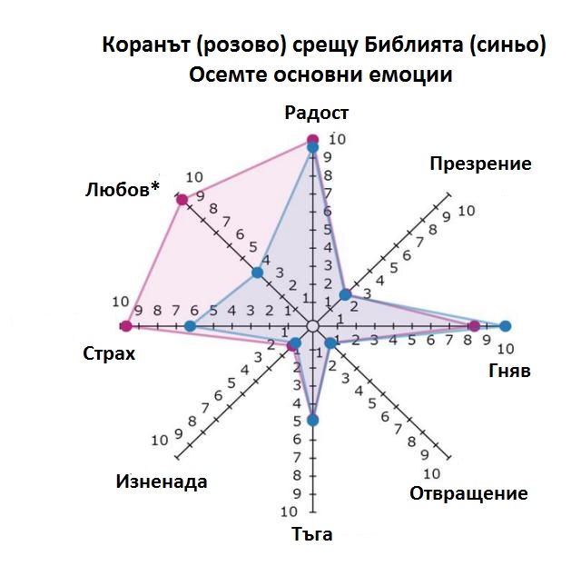 Но една от най-значителните разлики е между честотата на положителните емоции в Корана, сравнени с двете книги на Библията, което е показано по-долу.