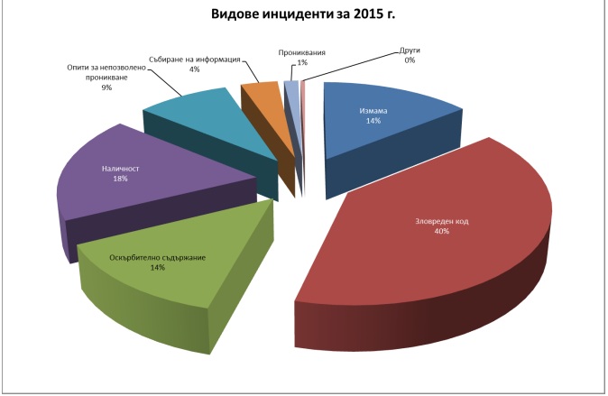 737 са регистрираните у нас кибер инциденти през 2015, показват данни на Националния център за действие при инциденти в информационната сигурност (CERT България) в Изпълнителна агенция ЕСМИС. Най-голям е броят на тези със зловреден код – 294, следвани от измами – 105, такива с оскърбително съдържание – 100, опит за непозволено проникване - 65, събиране на информация – 26, прониквания - 10.