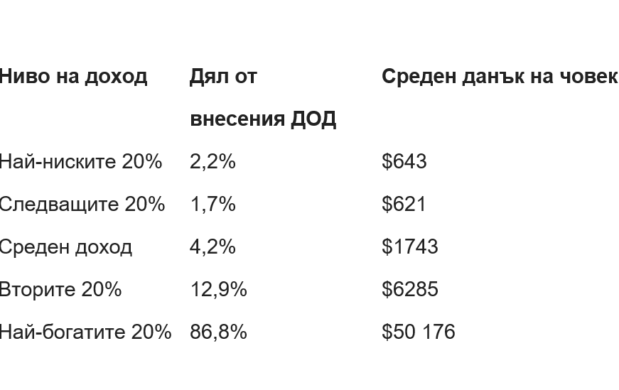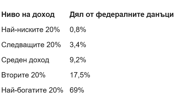 Най-богатите 1% от американците, които имат среден годишен доход от $2,1 млн., плащат 43,6% от ДОД в САЩ, като "каймакът" от свръхбогатите 0,1% (115 000) домакинства, чийто доход е $9,4 млн., внасят над 20% от всички данъци.