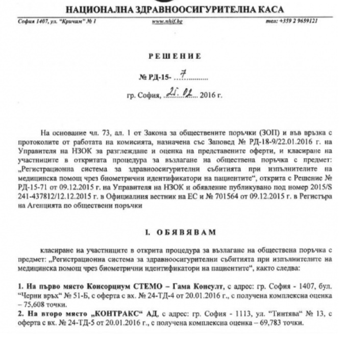 Победителят обещава да изгради новата система за 447 хил. лв. с ДДС и ще предлага четците на биометрични данни на единична цена от 286.80 лева. Още миналата седмица от здравната каса уточниха за Клуб Z, че фирмата, която спечели търга, ще предоставя също и устройствата, които ще преобразуват "отпечатъците" в персонален цифров код. Само така ще бъдат напълно съвместими със системата на всички нива от преработката и съхранението на необходимите данни.