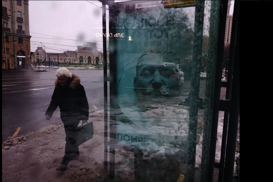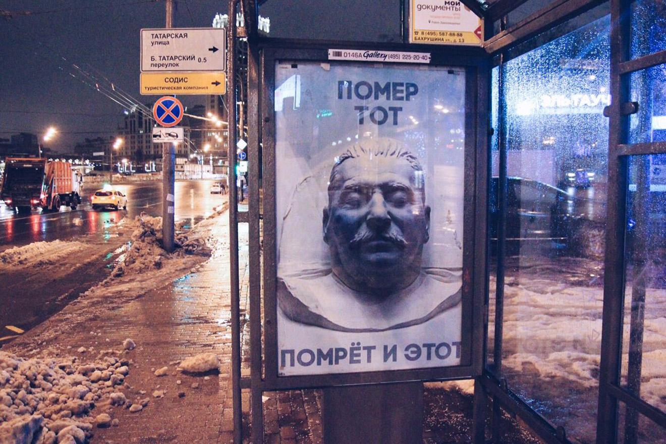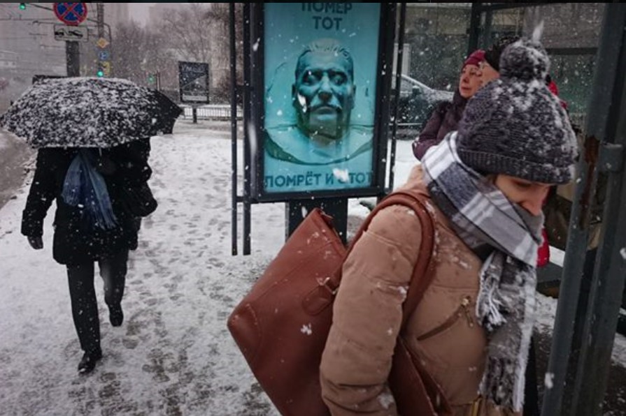 Плакат със снимка на мъртвия Сталин се появи на автобусна спирка в Москва, съобщиха в туитър жители на руската столица.