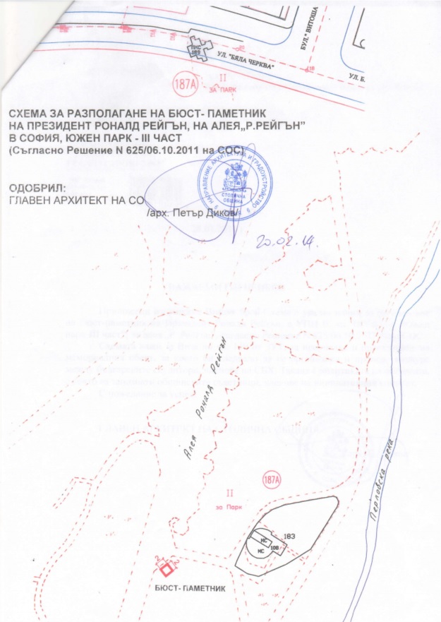 Комитетът минава през всички процедури и бившият главен архитект на София Петър Диков подписва схемата за разполане на паметника, т.е. решава къде точно в парка да бъде поставен - накрая на входната алея откъм бул. "Витоша", вляво от "Птиците" и в съседство с паметника на бившия генерален секретар на НАТО Манфред Вьорнер. Ето схемата: