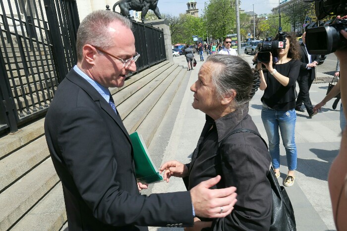Шефът на Върховния касационен съд излезе на стълбите между двата лъва и говори с протестиращите за кратко.