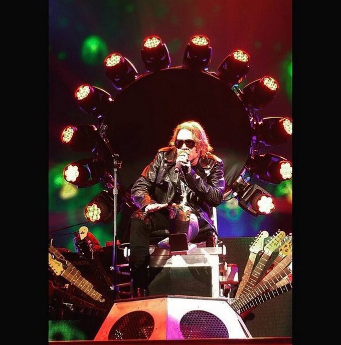 Фрактурата обаче не само не провали шоуто на бандата в новата T-Mobile Arena в Лас Вегас, а го превърна в истинска атракция. Аксел се появи на сцената на трон. Буквално.