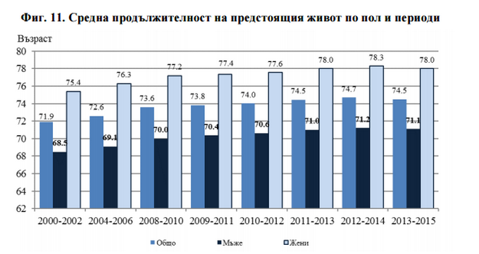 Показателят се изчислява като се вземат данните за тригодишен период. Според данните в периода 2013 - 2015 г. средната продължителност на живота у нас е била 74,5 години, докато за периода 2012-2014 г. тя е била 74,7 години.