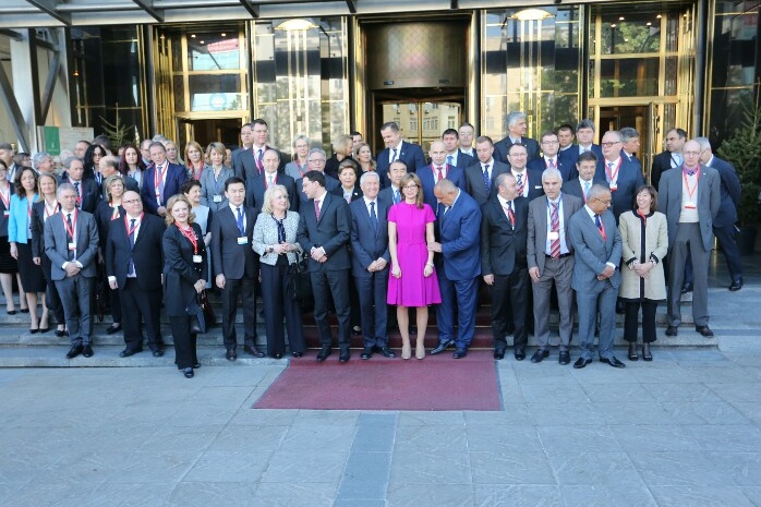 Борисов се снима за спомен с правосъдните министри от Съвета на Европа. До него е министър Екатерина Захариева в цикламена рокля. Снимка Веселин Боришев