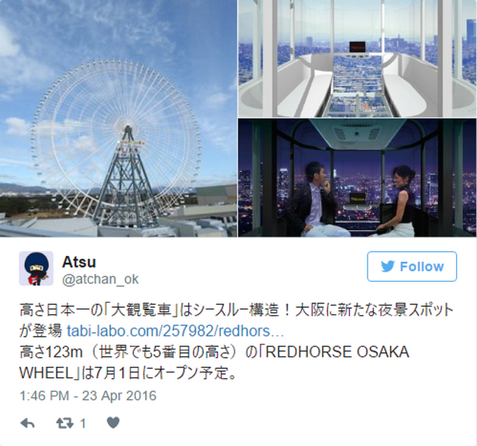 Поздравления: Вие сте достатъчно смели да се повозите на виенското колело Redhorse в Осака, което ще се извиси на цели 123 метра над земята. Атракцията ще бъде открита през юли, а подът на кабинките ще бъде прозрачен, съобщава списанието Travel+Leisure.