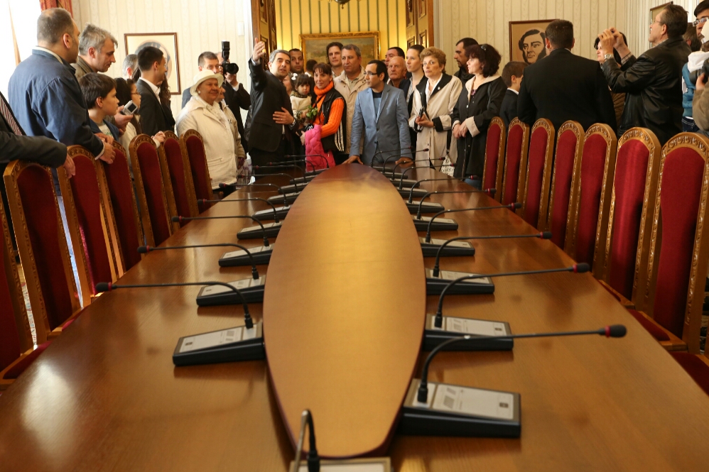 На първите посетители на президентската институция държавният глава отстъпи стола си в залата, където заседава Консултативният съвет за национална сигурност. Той им показа и работния си кабинет.